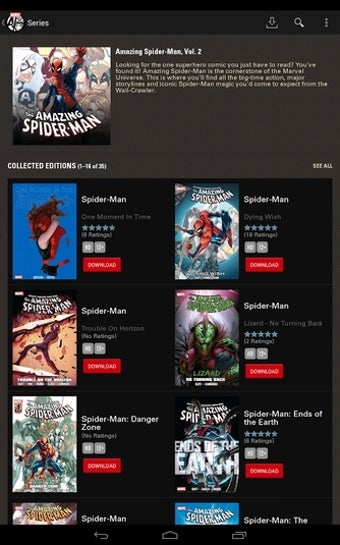 Le téléchargement de Marvel Comics est gratuit, ainsi qu'une partie du contenu. Toutefois l'application est surtout conçue comme un portail destiné à acquérir et télécharger des bandes dessinées. Vous ne pouvez pas importer le CBR de fichiers images ou de comics scannés et tout doit être téléchargé et commandé depuis l'application. Vous ne pouvez donc pas partager vos bandes dessinées comme lorsque vous étiez enfant. Ce n'est cependant pas un aspect dont vous vous soucierez à l'usage.
